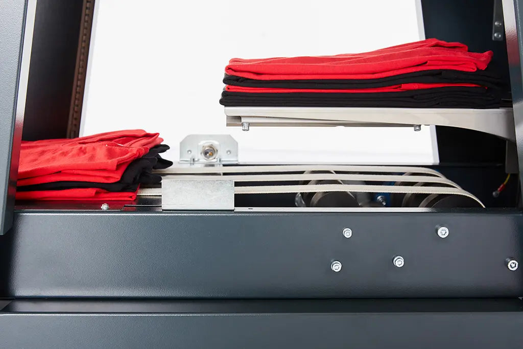 The STP-1000 automatic folder folds ready-made clothes quickly, quietly and accurately. It only requires one operator and is ideally suited for folding t-shirts. It can within limits be easily adjusted to fold different types and sizes of clothing in different ways.