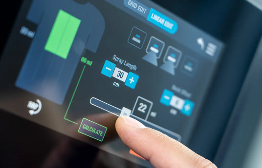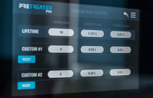 Task and consumption calculators tell you exactly how many garments were sprayed and how much liquid was used.