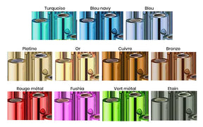 11 couleurs : Vert métal, rouge métal, or, argent, bronze, cuivre, bleu navy, bleu, étain, turquoise, fushia.