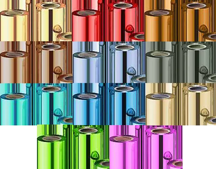 Feuilles métallisées de qualité standard pour la décoration de tissus enduits de colle ainsi que pour des rubans en PE ou PP.
