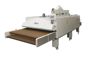 - La configuration du convoyeur à double bande permet de travailler simultanément avec deux temps de séchage indépendants. Chaque bande a son propre contrôle de vitesse qui peut être ajusté en fonction des besoins de l'encre ou du vêtement.
